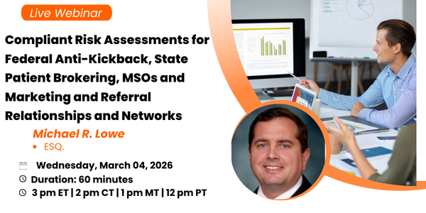 This webinar is the second in a 12-part compliance risk assessment series being presented by Halos4Health and Skill Acquire. It is designed to educate and train health care, compliance and risk management professionals and executives on implementing and conducting compliance risk assessments in the areas of compliance with federal Anti-KickBack Statute, state patient brokering, anti-kickback and fee-splitting laws, marketing, referral relationships, MSOs, Medical Director relationships, etc., and then using the assessment results to identify and address gaps in an entity’s compliance.