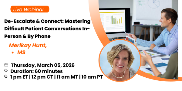 Handling an angry patient in healthcare is important because it allows for a continued therapeutic relationship, prevents escalation of the situation, maintains patient trust, and ultimately leads to better health outcomes by ensuring treatment can be administered effectively and without disruption. This webinar will help you to know and understand the proven phone or in-person communication strategies on how to quickly identify why a patient is really angry and how to defuse the situation to make the situation stabilized. Neglecting an angry patient could result in them leaving care, not following treatment plans, and potentially harming themselves or others. Dealing effectively with an angry patient over the phone requires excellent communication and listening skills to resolve the situation peacefully and successfully.