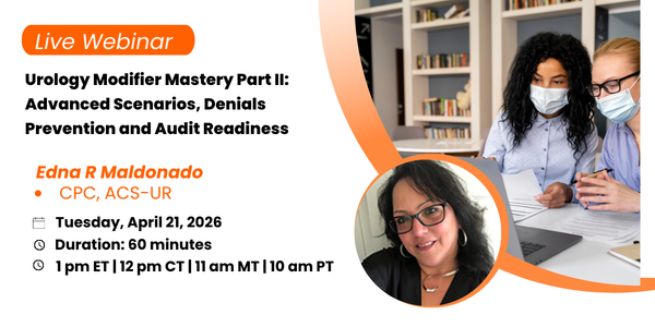 This Part II webinar is designed for coders, billers, managers, providers, residents and APPs who want to move beyond the basics and tackle real-world challenges in urology coding.Â